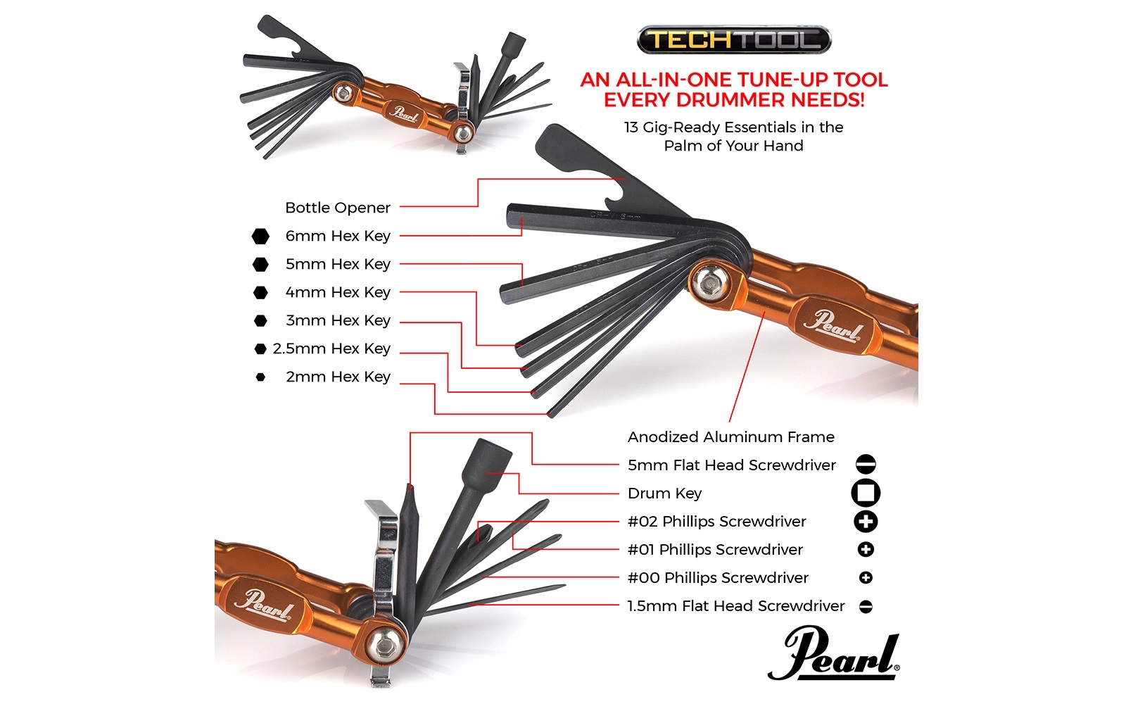 The Pearl TechTool features 13 gig-ready tools specifically selected to fit all Pearl drums, pedals and hardware.