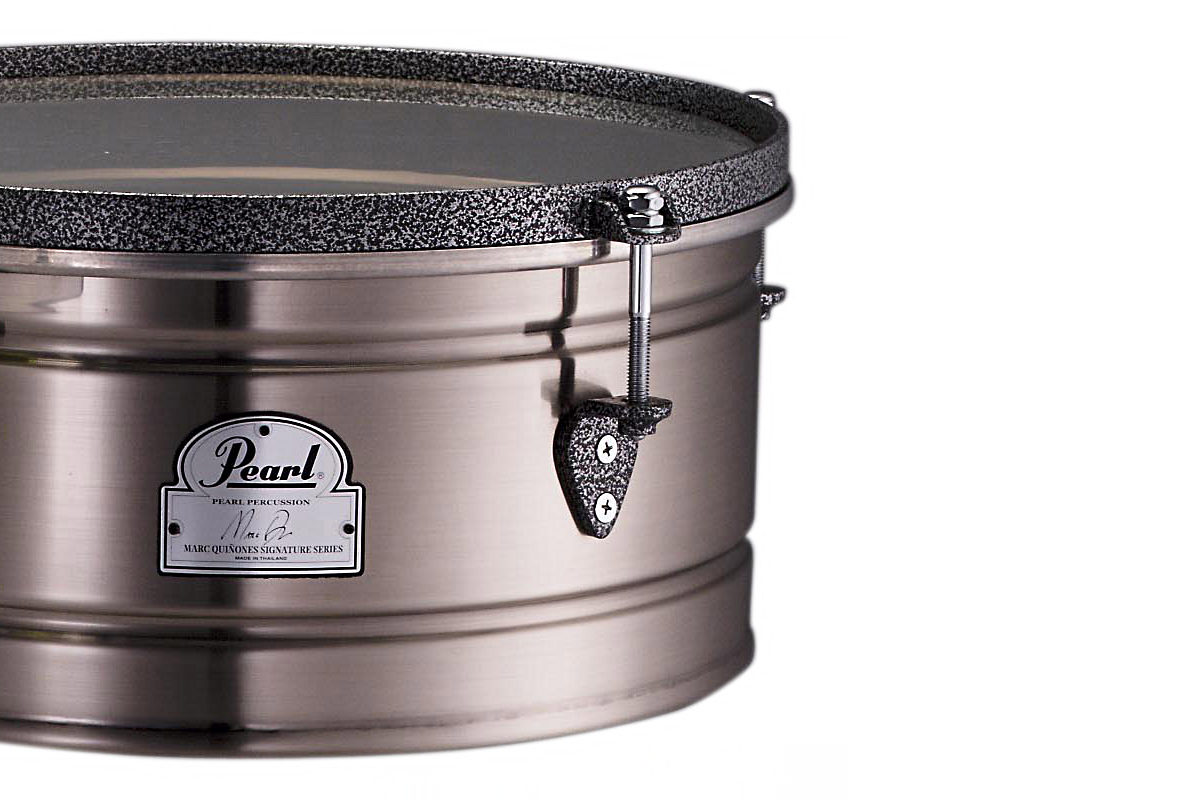| Designed in conjunction with one of today's premier percussionists, Marc's timbale set consists of standard 14" and 15" drums fitted with Remo Clear Ambassador heads, a double-braced tilting stand, and our top-selling PBL-30 Clave Block. The Polished Steel Timbale Shells have two inverse beads that not only add strength, but also produce a cutting "cascara" sound not hindered by normally outward facing beads. To further the "cascara" striking area, these timbales feature a 5-Lug design that is proportioned perfectly for maximum shell space with less lug interference. Tuning is a breeze with the top tuning lug design. This exclusive Pearl design cuts head-changing time in half. No more nuts and washers falling on the floor! Finally, the cowbell post features a Sympathetic Sound Dampening sleeve that keeps cowbells and blocks from ringing through the stand. |