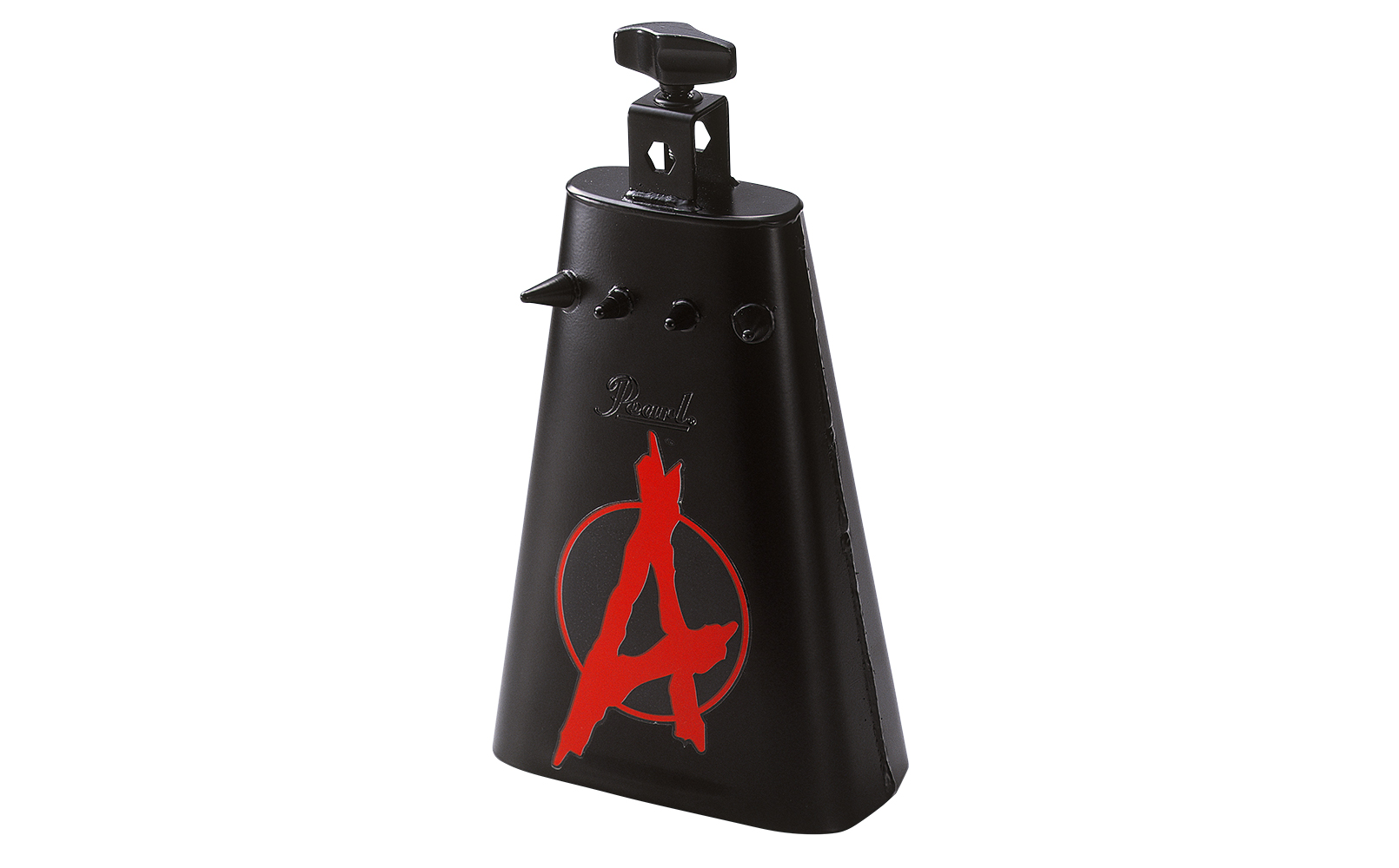 The 10" PCB-20 Anarchy Series Heavy Metal Cowbell includes an Anarchy symbol, metal spikes on top, and a power flange on the edge of the cowbell saves your drumsticks from wear and tear.