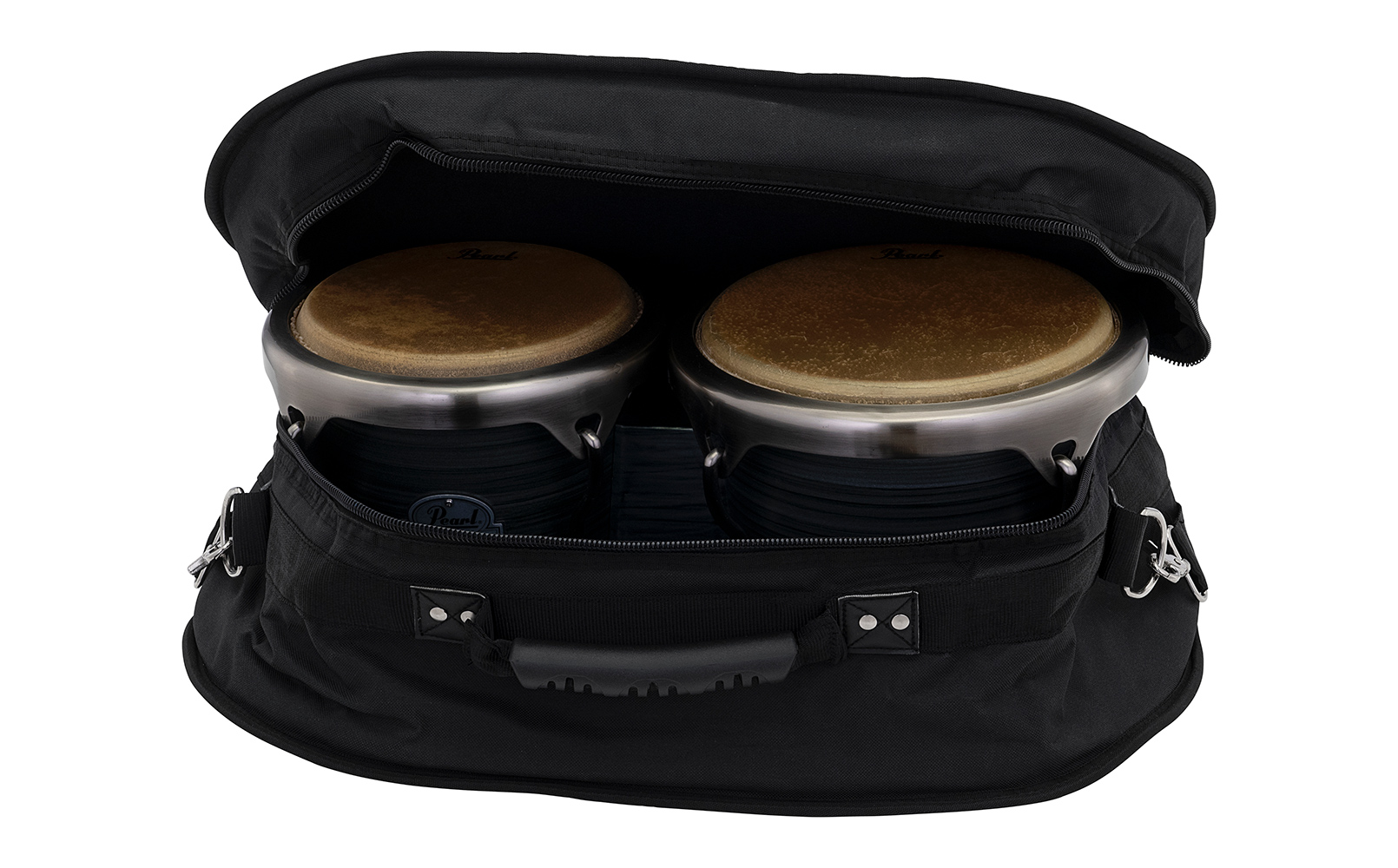 | Pearl's Bongo Bag features a plush padded interior, rubber feet, detachable shoulder strap, reinforced carrying handle and large outer pocket for your percussion accessories. The PSC-BB fits all Pearl Bongo models and most all others on the market. Bongos sold separately. |