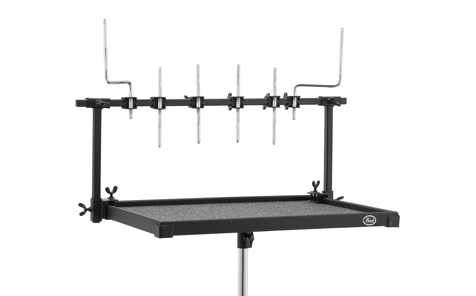 Pearl's Universal Trap Table Rack easily attaches to virtually any trap table 24" wide or less. The rack clamps to the table top and the cross bar is adjustable to accommodate different size tables. The rack includes four straight 3/8" rods and two "Z" rods for endless percussion mounting possibilities.