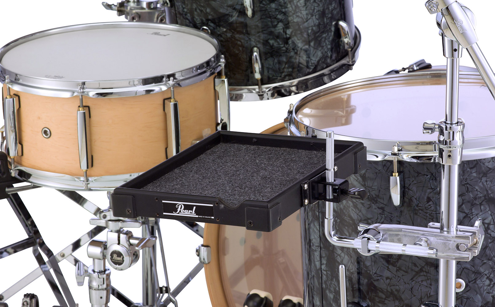The Pearl Tech Tray can be mounted to cymbal stands, hi-hat stands, or off a bass drum with the use of any 3/8" arm adapter.