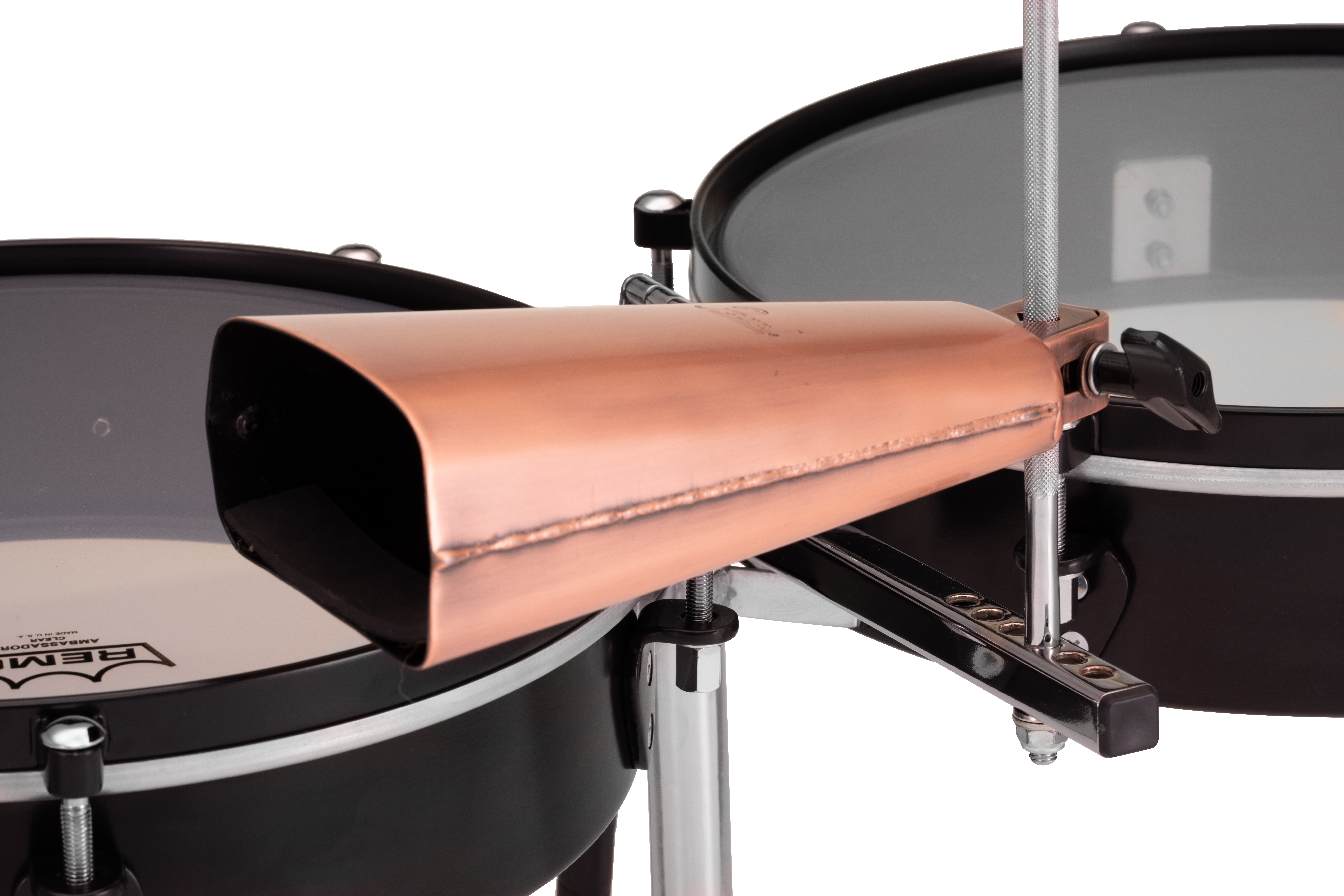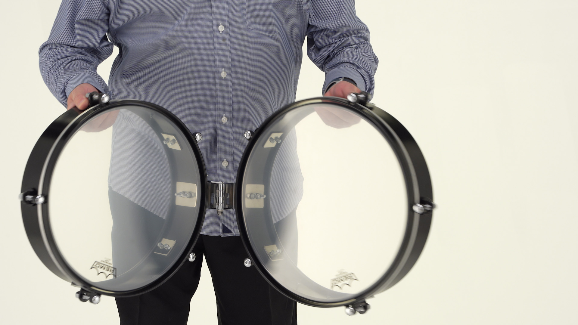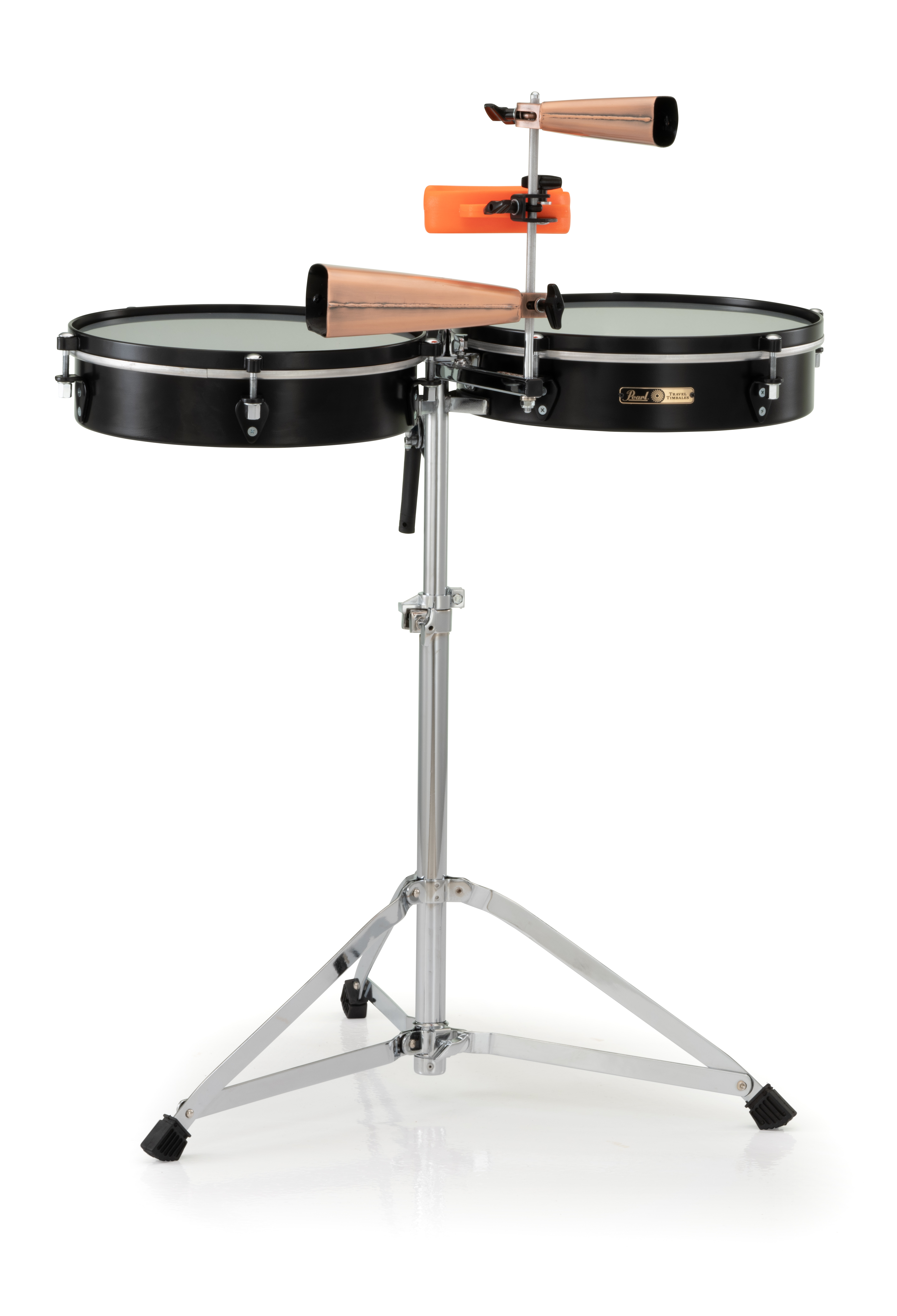 | The Travel series of Congas and Bongos has a new sibling - the Travel Timbales. The 14" and 15" steel shell timbales are professional size in diameter but only 4" deep. The drums are connected by a hinge that marries to the Quick Release stand. The custom hinge allows the drums to be folded together into the size of one standard depth timbale for easy storage and transportation. The Travel Timbales come with and a single braced stand that includes an 11.25" adjustable accessory post. The accessory post has 6 positions that allow cowbells and blocks to be placed the perfect distance from the player. The steel shells feature a black lacquer finish and USA Remo clear Ambassadors heads for a truly professional sounding instrument. FEATURES: 14" and 15" steel timbales 4" deep for easy storage and transport Single braced Quick Release stand Adjustable accessory post included Black lacquer finish Remo Clear Ambassador Heads |