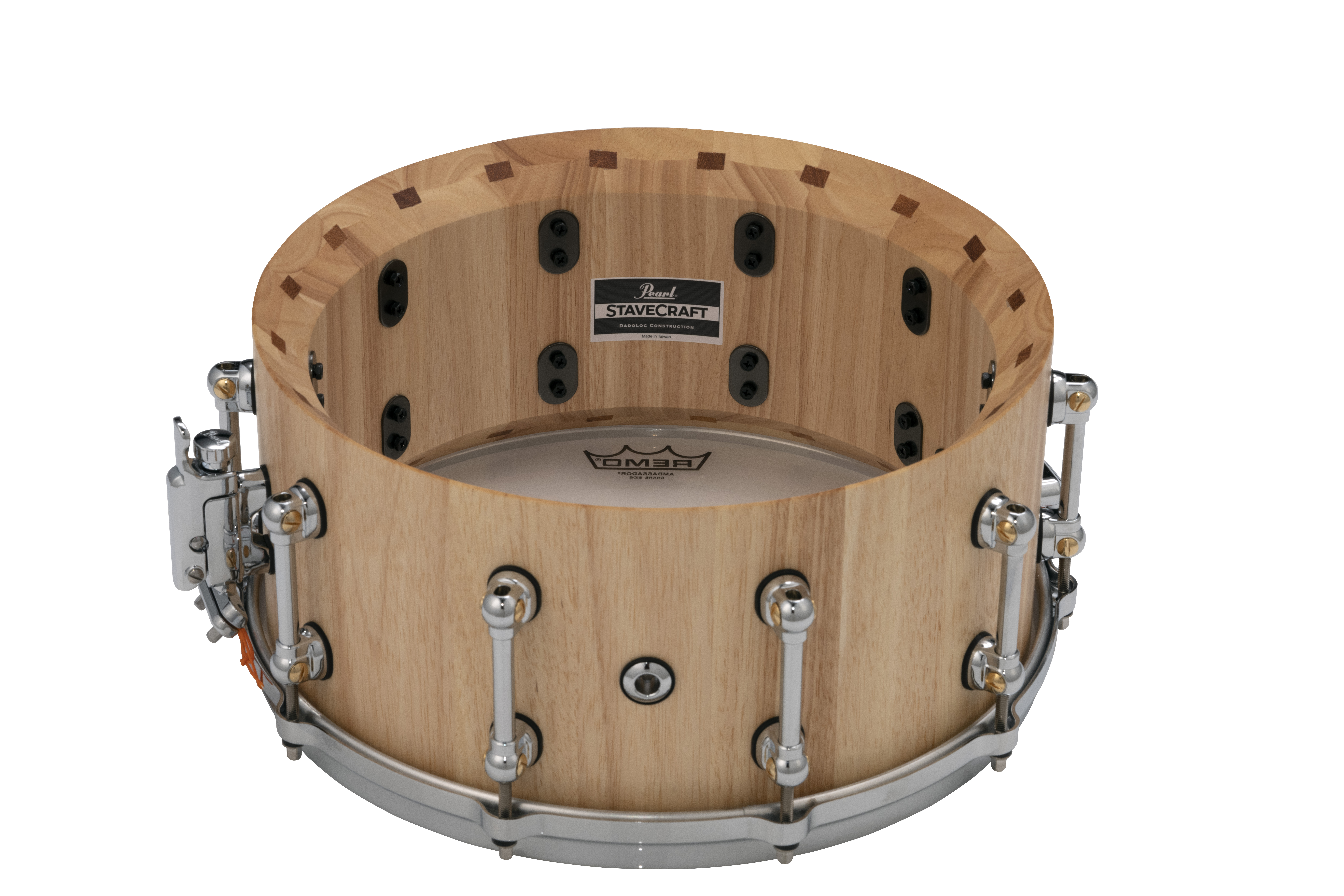 | Yielding solid shell tonal snare spike from a bright mix of hardwoods, Pearl's StaveCraft snare drums are the perfect fusion of old-world workmanship and new-school performance. Each 25mm thick shell starts from two layers of meticulously beveled solid Thai Oak staves. Using a principal exclusive to Pearl, an added stave of exotic Makha wood is inserted into the center Dado channel formed by each stave. Like pieces in an intricate puzzle, this "Dado-Loc" joint increases total shell strength by 50%. The shell is then lathed to a perfectly round 25mm thickness, hand finished, and fitted with our Swivel Tube Lugs and MasterCast die-cast counter hoops for added volume and tuning precision. Producing sharp sonic focus and piercing volume for the heavy player, StaveCraft snares are a startling addition to any pro player's drumming soundscape. FEATURES: 25mm thick, two layered solid Thai Oak Stave Shell Exclusive Exotic Makha Wood Dado Joint for increased shell strength. Remo USA CS Black Dot Clear Batter 45-degree Bearing Edges MasterCast Die-Cast Hoops STL-65 Swivel Tube Lugs |