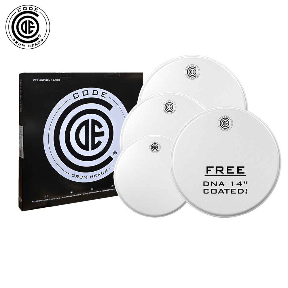 | Code drum heads are purpose-built, designed by drummers for drummers. They have matched time honoured and trusted manufacturing techniques with up to date cutting edge technology to produce a new premium range of drum heads. All their heads use the highest quality PET polyester film, kept securely in place by Code's revolutionary Grip-Tightâ„¢ rim technology. This unique innovation features a deep, double-knurled solid steel core securely crimped by a high-quality aluminium rim, to ensure the head stays put while you play. It also allows the head to resonate freely, tune easily and super quick, and hold its tuning longer. Plus, all materials used to manufacture Code products are 100% recyclable. Code DNA series coated heads have a 10 mil single ply of high quality PET film that gives an old school warm sound with strong attack and medium sustain. DNA heads can be used as batter or reso heads. Pack of 3 tom heads with FREE DNA 14" Coated Snare Head! | |||||||||