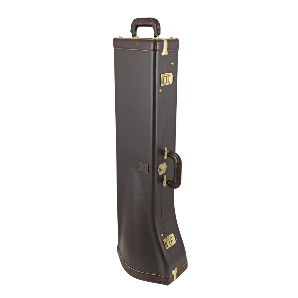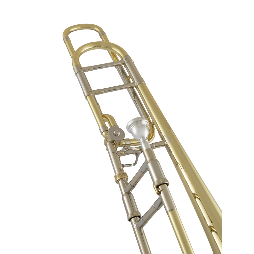 .547" large bore, open wrap F attachment with standard rotor, 8-1/2" one-piece hand-hammered yellow brass bell, yellow brass outer slide, lacquer finish, Bach mouthpiece, woodshell case.