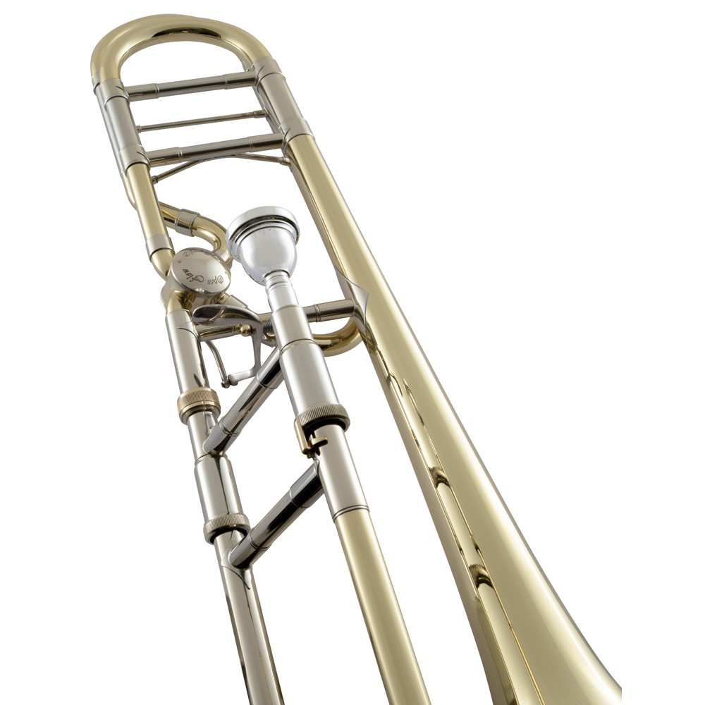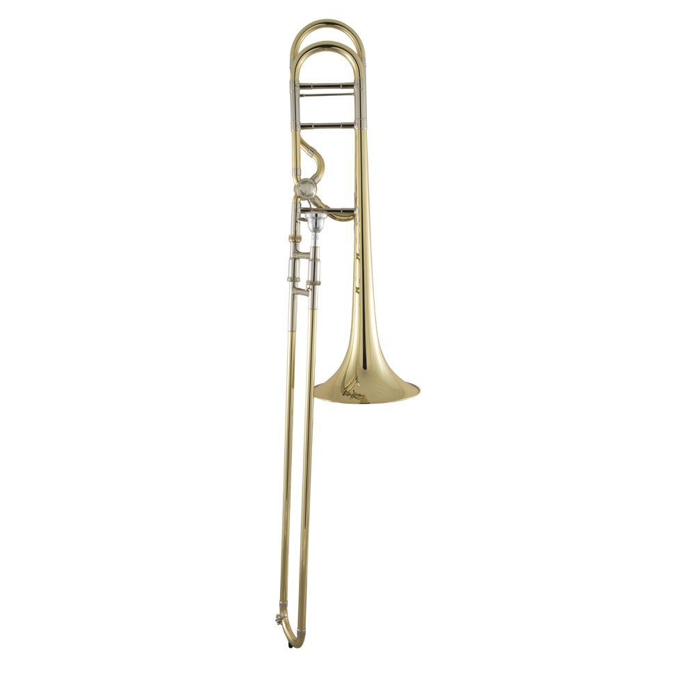 .547" large bore, open wrap F attachment with "open-flow" rotor, 8-1/2" one-piece hand-hammered yellow brass bell, yellow brass outer slide, lacquer finish, Bach mouthpiece, woodshell case.