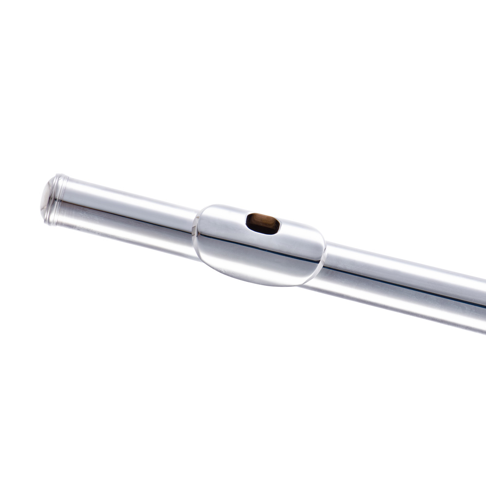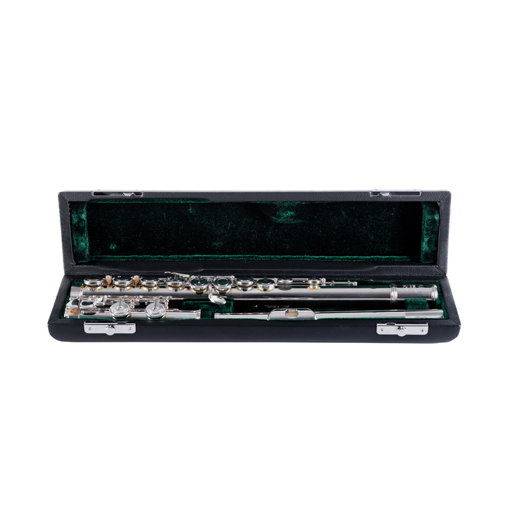 Silver plated Japanese nickel headjoint and body, pointed arms, Open Hole, C Foot, Offset G, Split E. Deluxe French-style case and case cover.
