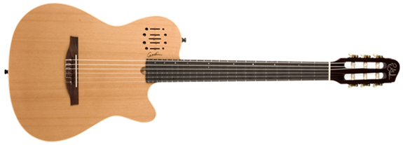 The Multiac Encore nylon string, also features a 25.5" scale and a comfortable nut width, making it easy for electric steel string players to transition to nylon strings. This model features a chambered silver leaf maple body with a solid cedar top, as well as a dual source preamp with volume, treble, mid, bass and blend control sliders.